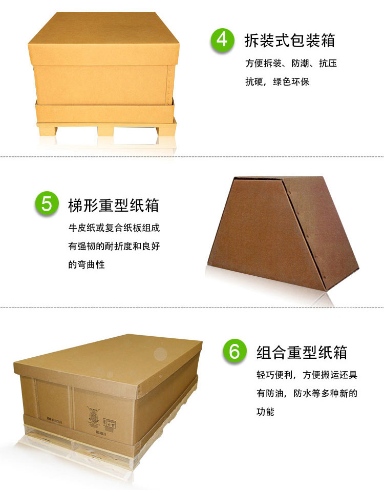 八、3A重型紙箱 重型包裝紙箱適用于放置易碎、易壓損、易變形精細(xì)器件、重型等貨品,可與紙托盤連在一起配套出產(chǎn),這樣更有用地避免貨品移位,更易于裝貨柜。